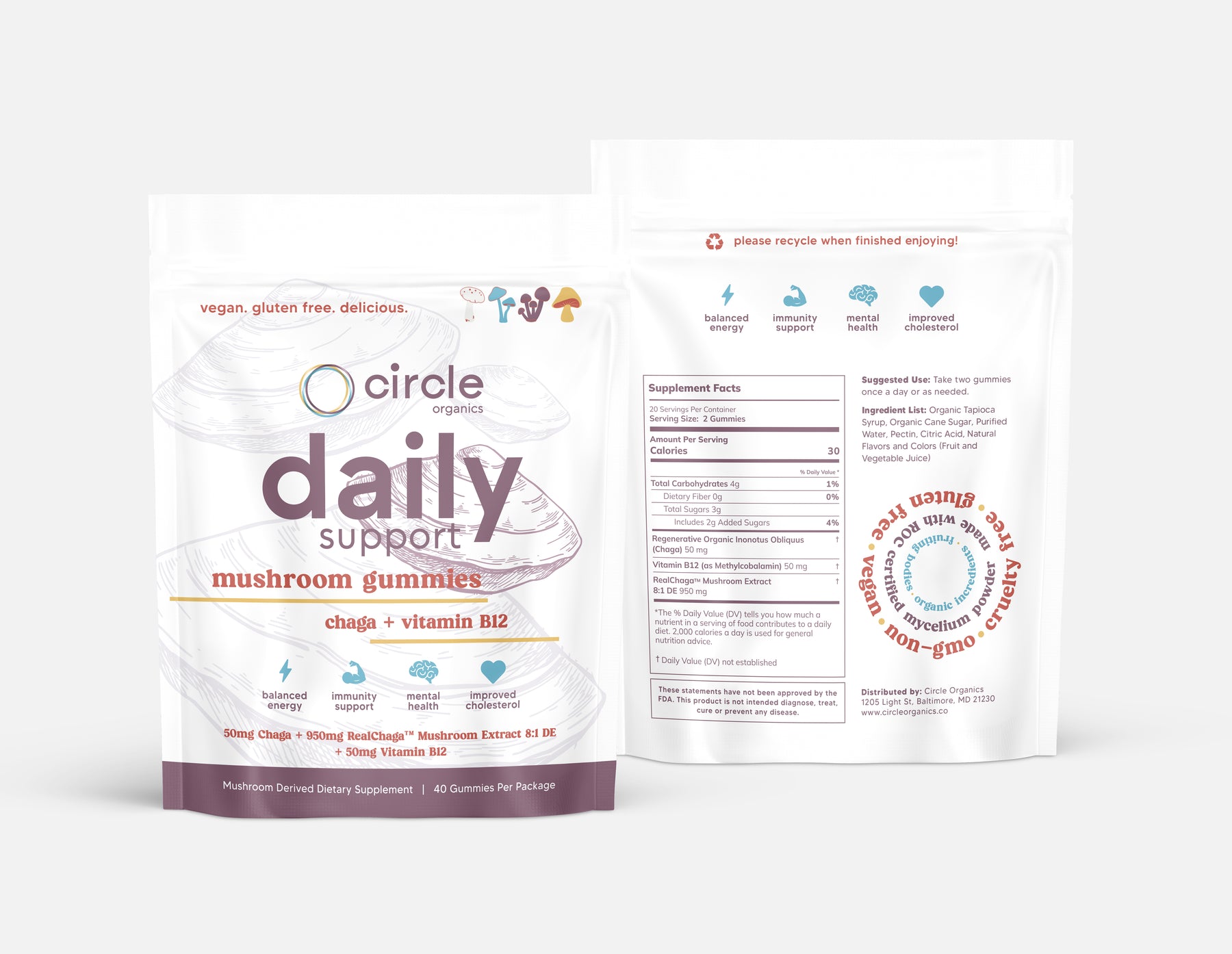 Circle Daily Mushroom Gummies 40ct are a scientifically formulated supplement that combines Regenerative Organic Inonotus Obliquus, Vitamin B12, and RealChaga Mushroom Extract in an 8:1 ratio.